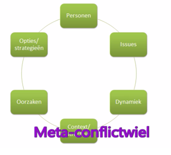 Het model van het metaconflictwiel loopt zoals u kunt zien in een rondje. Je begint bij welke partijen er betrokken zijn bij het conflict. Je hebt de twee 'hoofd' partijen en de omstanders die ook betrokken zijn bij het conflict. Bij de issues ga je kijken wat nou precies het probleem is. In de dynamiek ga je een inschatting maken aan de hand van het escalatiemodel van Glasl of het conflict nog wel te bemiddelen is of dat een bovenpartijdige conflictbeslechting beter past in deze situatie. In de context ga je na wat er precies de context is van het conflict, wie of wat spelen er ook mee. Daarna ga je precies na wat de oorzaken zijn van het conflict. Bij opties en strategieën ga je bekijken hoe het conflict zou kunnen worden opgelost. Hoe kun je de partijen het beste benaderen om tot een oplossing te komen of om de situatie te laten de-escaleren.
